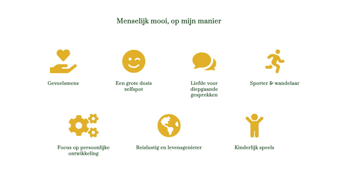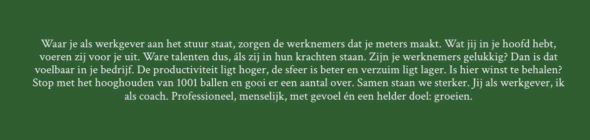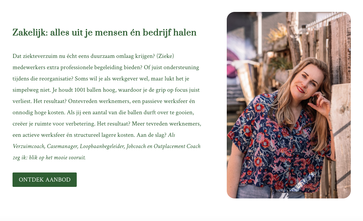 Krachtige koppen die aanzetten tot nadenken, duidelijke uitleg over haar diensten/resultaten en de juiste emotionele triggers. Dit allemaal in een persoonlijk, maar professioneel jasje. Een totaalplaatje dat vertelt dat menselijkheid de basis is van groei. Op zakelijk én persoonlijk vlak – bij iedereen op een eigen manier.