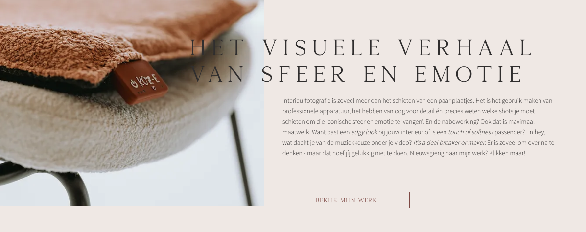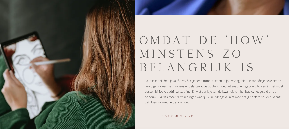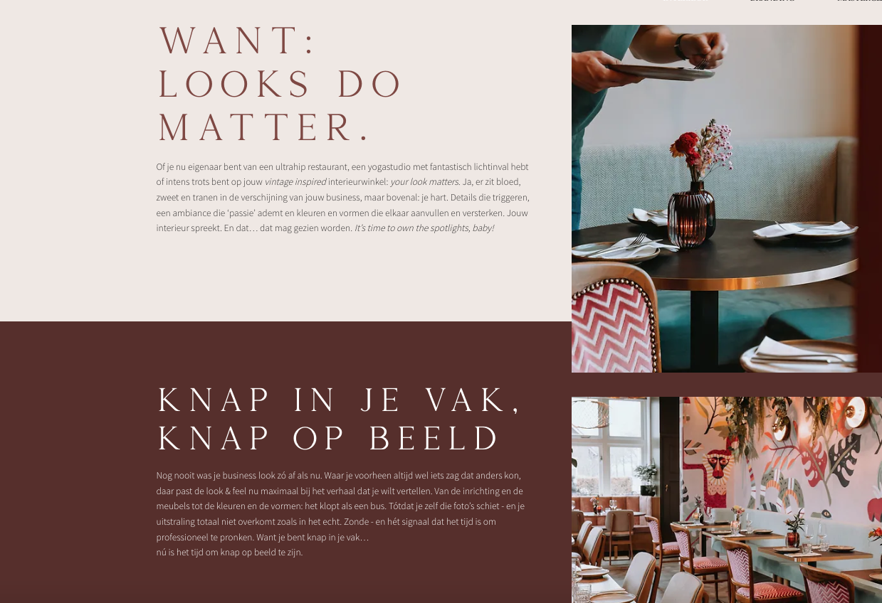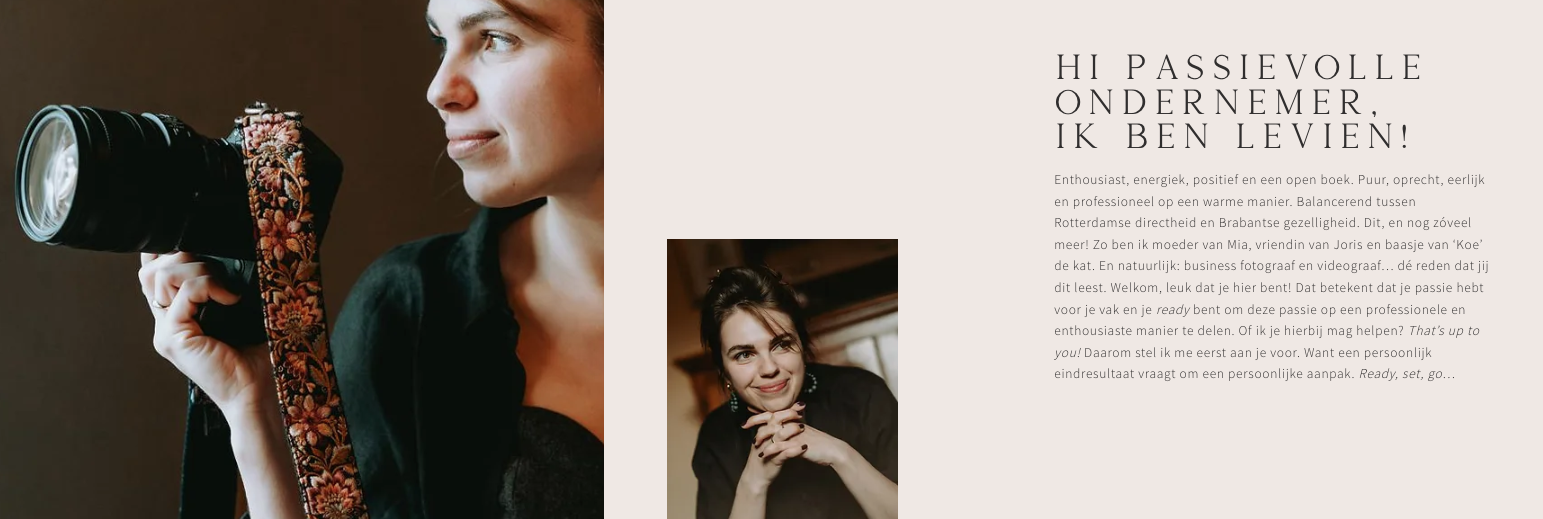 Teksten die barsten van de passie, professionaliteit én persoonlijkheid. Een duidelijke hiërarchie die de lezer moeiteloos door de website navigeert én die zorgt voor een ‘yes, wil ik!’-gevoel. Geen saaie dertien-in-een-dozijn copy, maar teksten met hier en daar een woordgrap, persoonlijke note en passende quote. Alles zodat ondernemers de vibe van Levien voelen. Via haar prachtige foto’s – en de rake teksten.